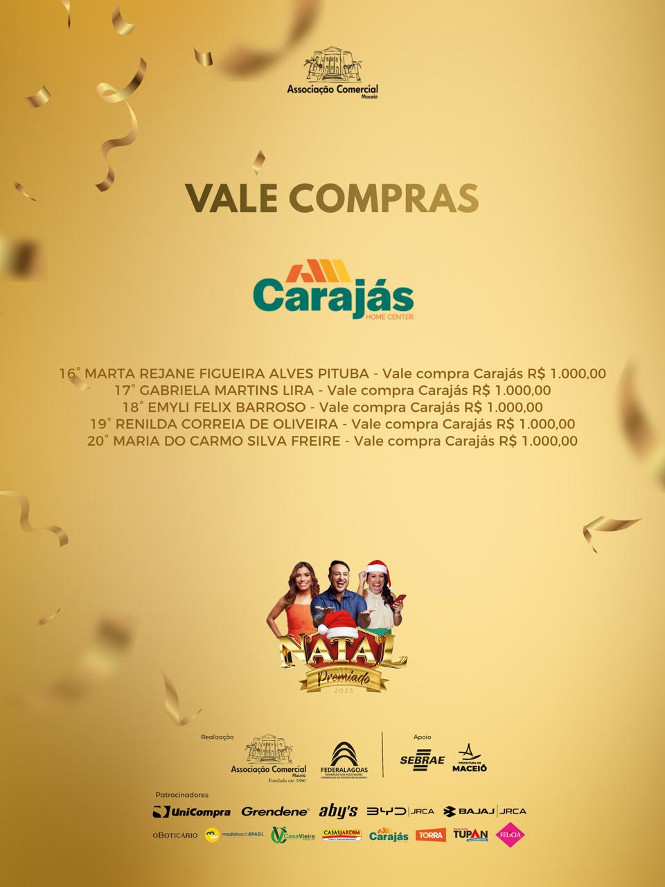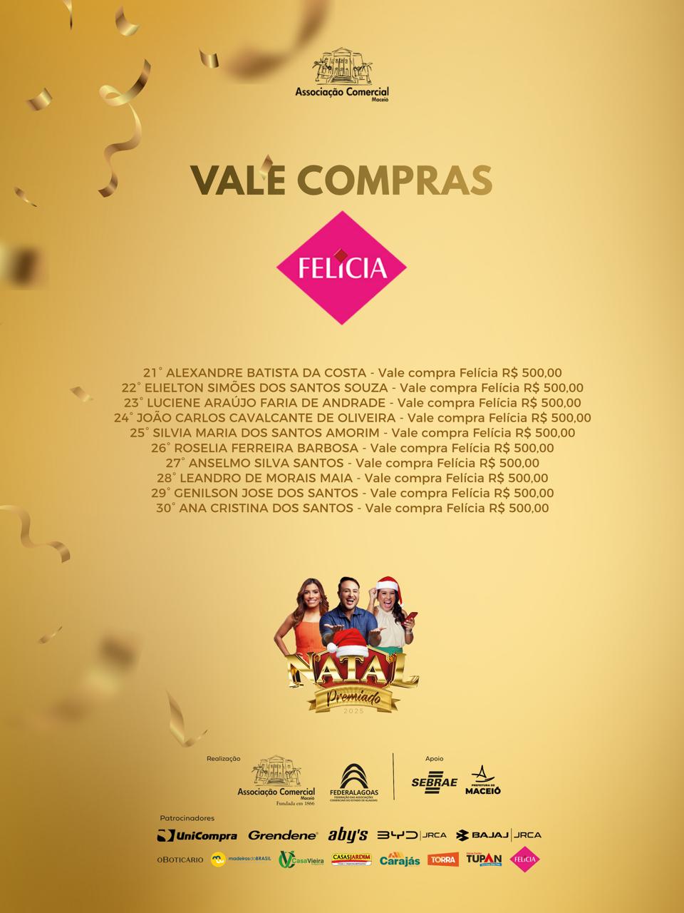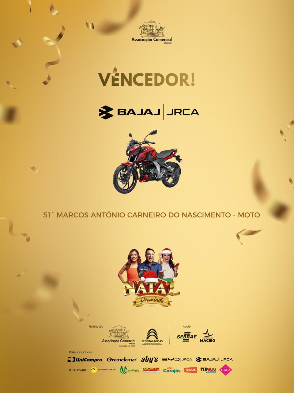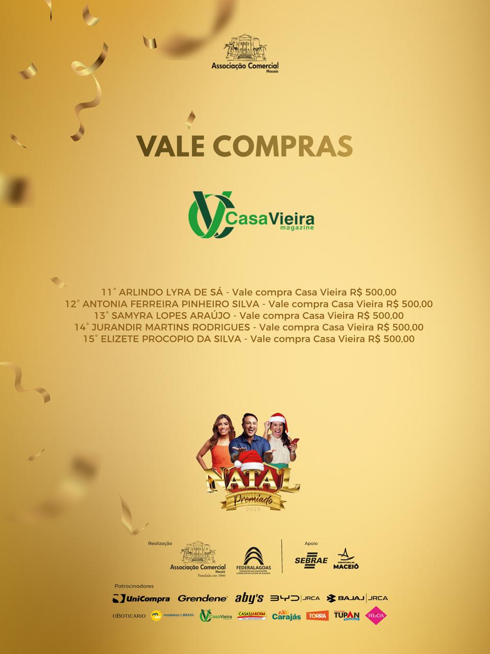 A Associação Comercial de Maceió e a Federalagoas divulgam o resultado dos ganhadores da campanha Natal Premiado 2025, que sorteou 50 vales-compra, de R$ 500 e R$ 1000, além de um carro e uma moto.