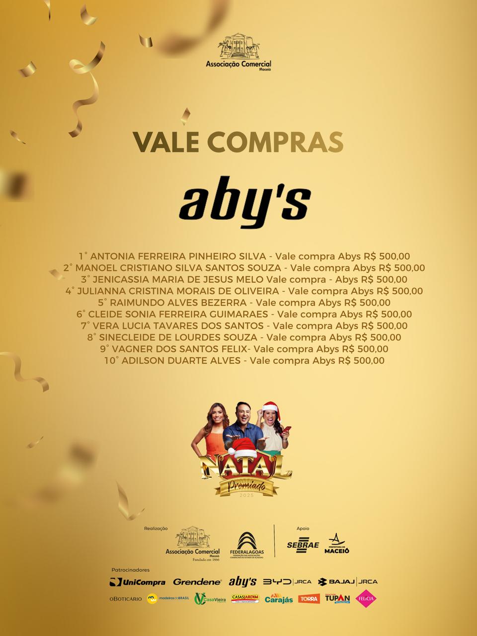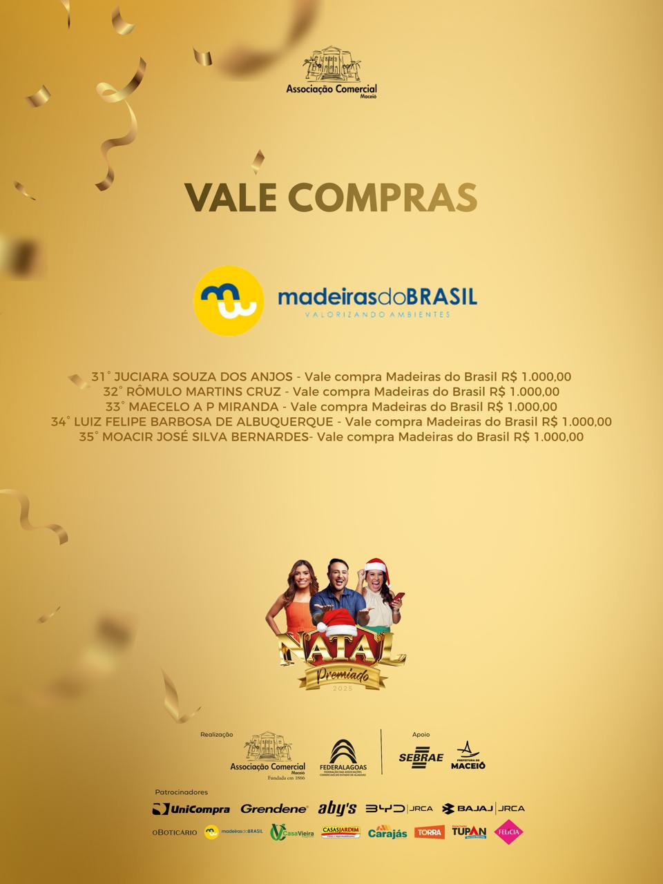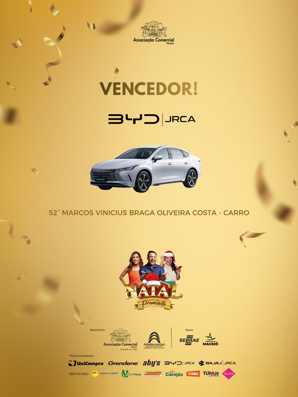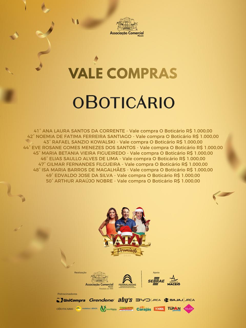 A Associação Comercial de Maceió e a Federalagoas divulgam o resultado dos ganhadores da campanha Natal Premiado 2025, que sorteou 50 vales-compra, de R$ 500 e R$ 1000, além de um carro e uma moto.